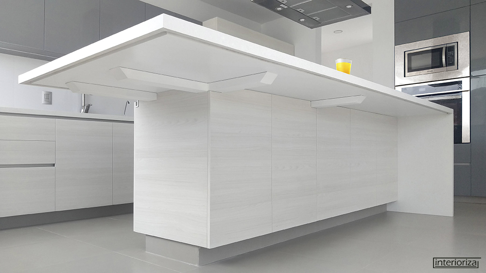 Configurada en “L” con una isla al centro. Puertas en laminado plástico color Teka Ártico y laca color Gris Oxford al alto brillo. Cubierta en Cuarzo color Organic White.