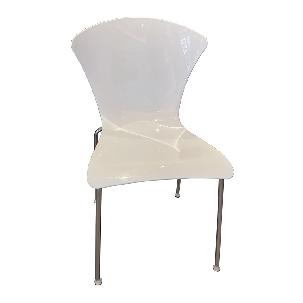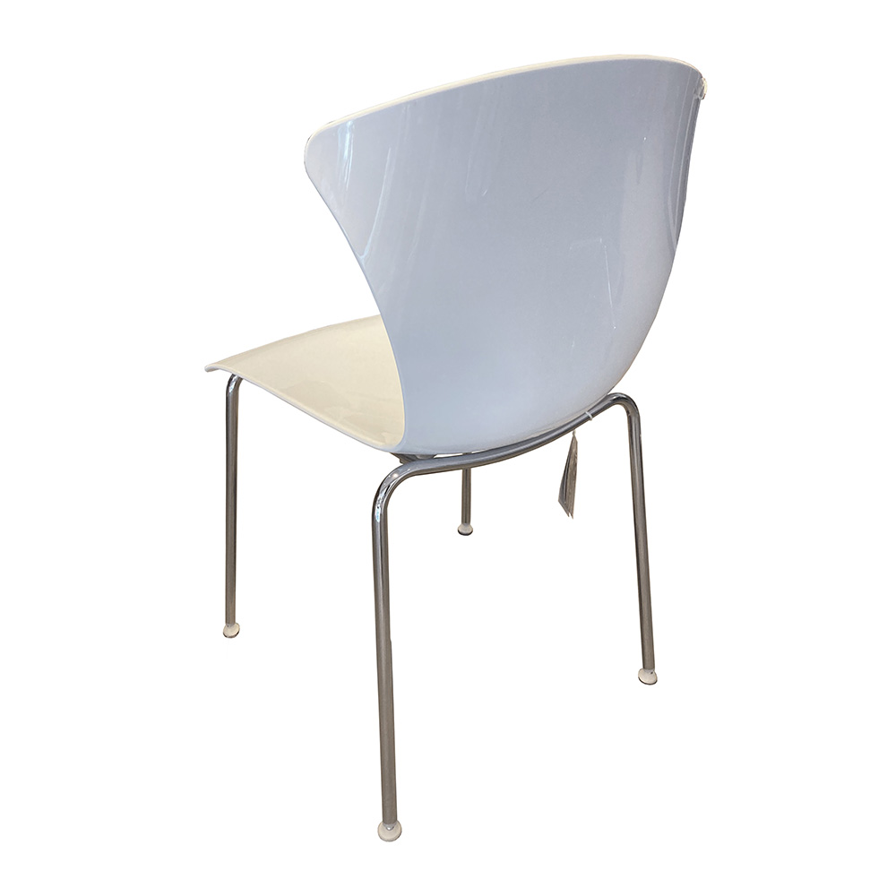 Asiento y respaldo fabricados en policarbonato en una pieza, disponible en color blanco.